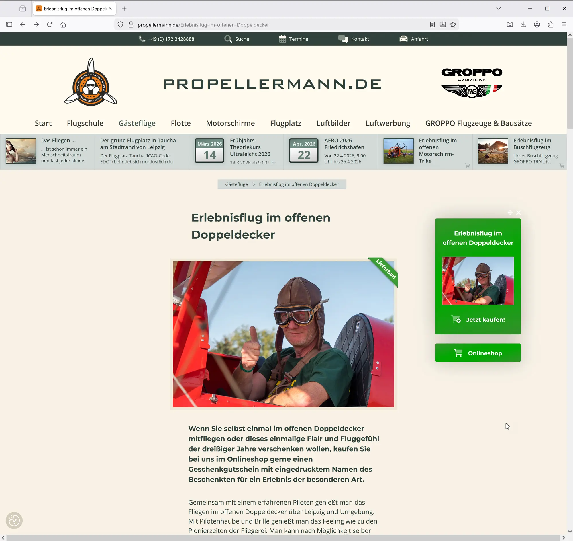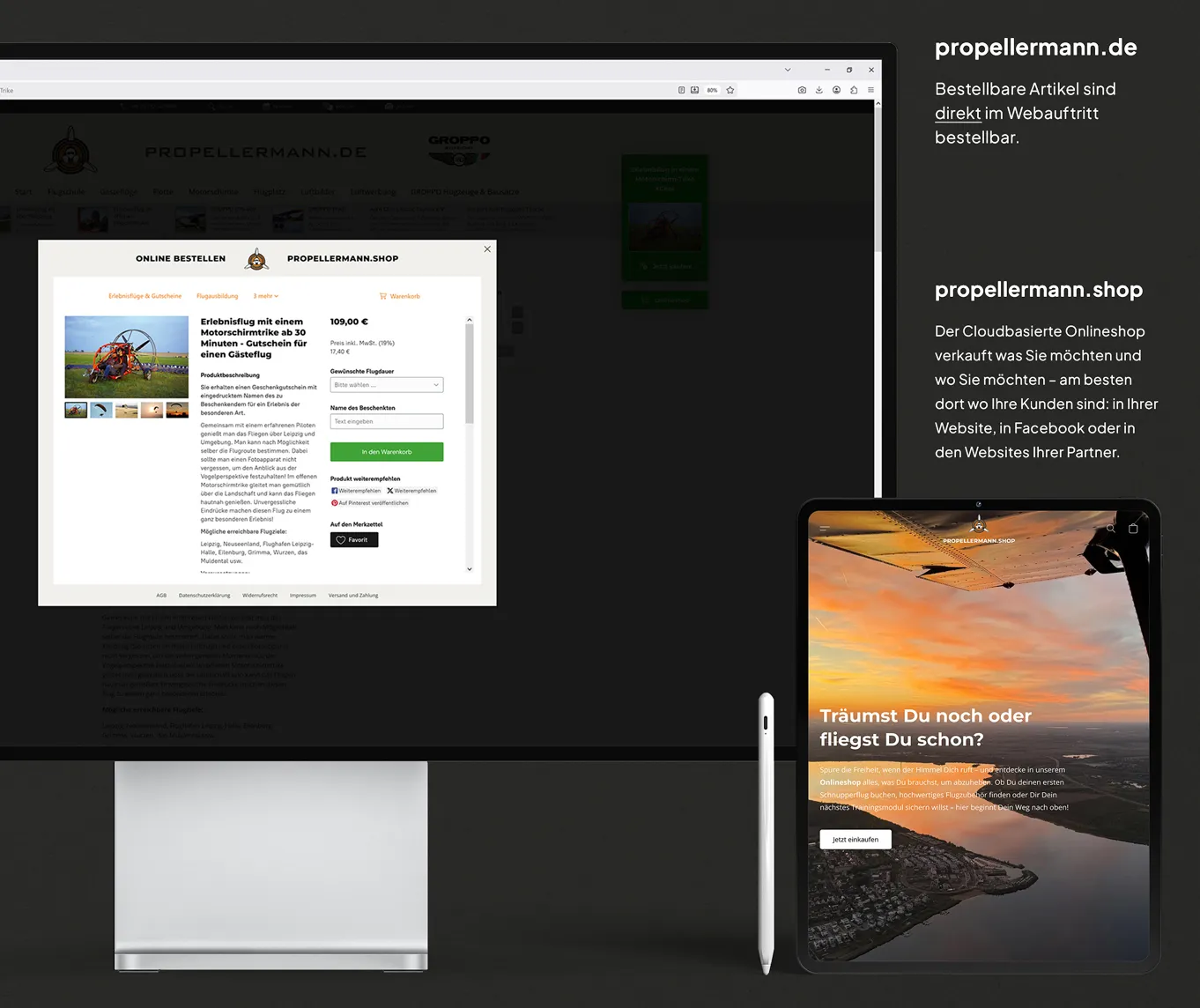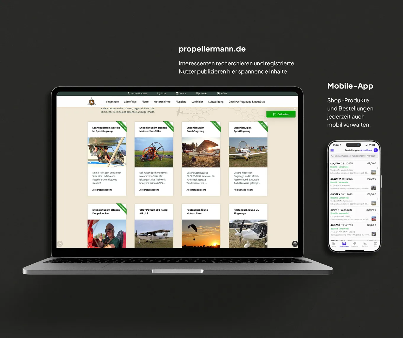 Auf 'propellermann.de' und 'propellermann.shop' kommt man der Faszination des ultraleichten Fliegens sehr nahe. Ob Ausbildung, unvergessliche Flugerlebnisse oder wichtige Ersatzteile — alle Inhalte sind leicht erreichbar, lassen sich mühelos pflegen und Buchungen bzw. Käufe sind direkt online möglich. Perfekt für alle, die das Fliegen praktisch erleben, entdecken und genießen möchten!